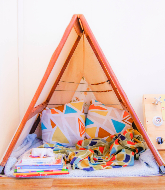 Внутрь я положила плед и подушки, иногда Тима берет с собой игрушки. Еще я хочу добавить туда подушку в форме облака, флажки снаружи и уютный детский ночник.