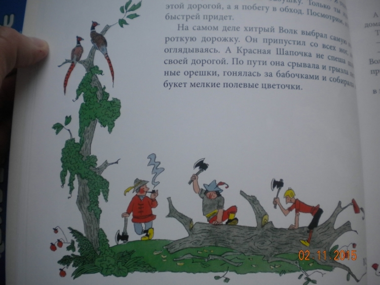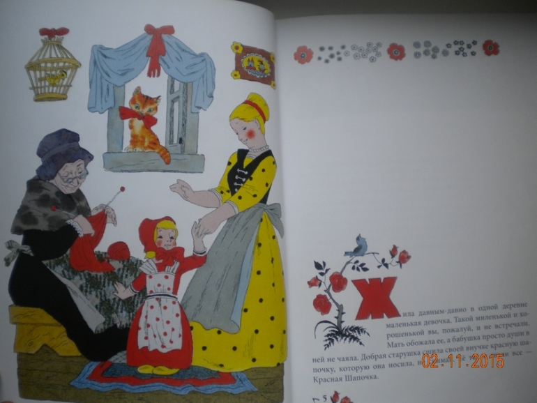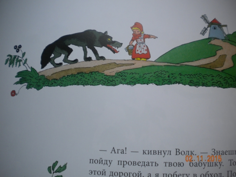 Мне в данной книге не понравился пересказ Л. Яхниной - как то уже привыкли, что Красная шапочка несет бабушке пирожки, а в нашей - лепешки. И в одном месте режет ухо странная фраза - лесной Кум Волчище((( Книга только и привлекает меня красочными и очень красивыми рисунками