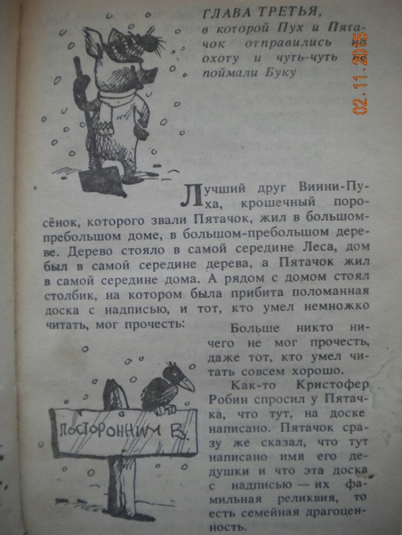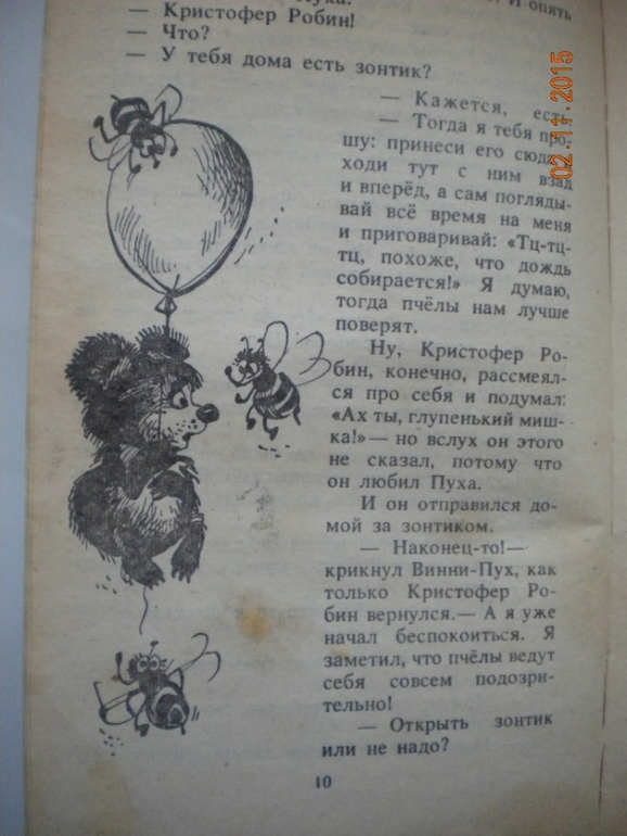 1. На самом первом месте оказалась старенькая книга моего детства "Винни-Пух и все-все-все" А.А. Милна. Моя мама чисто случайно нашла ее в коробке на чердаке. Вид конечно у нее очень потрепаный, да и уголки с обратной стороны скушали мышки, но доча ее так полюбила и прониклась к ней, что даже одно время таскала ее в сад. Слушает аж открыв ротик. А вот книга из Лабиринта с красочными картинками ей совершенно не понравилась - пришлось подарить другой малышке.