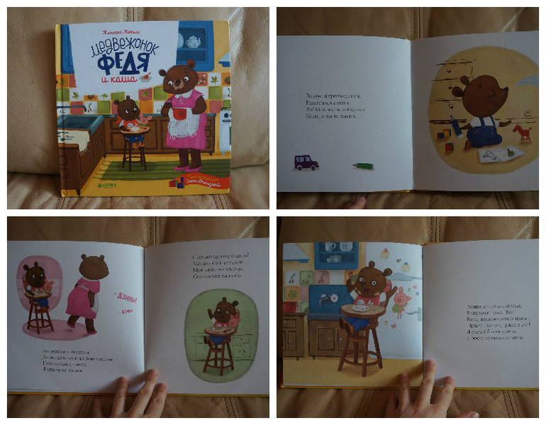 В этой книге в стихотворной форме рассказывается о том, как медвежонок научился кушать кашу сам. И именно после покупки этой книги моя дочка начала буквально отбирать у меня ложку. Возможно, конечно, это всего лишь совпадение)) Но в любом случае, и стихи, и иллюстрации нам очень нравятся. Есть еще вторая книга . Теперь ее тоже хочу купить) Совсем недавно об обеих этих книгах подробно писала девушка здесь, поэтому повторяться не буду, а просто дам ссылку на ее пост https://www.babyblog.ru/community/post/kids_books/3200135