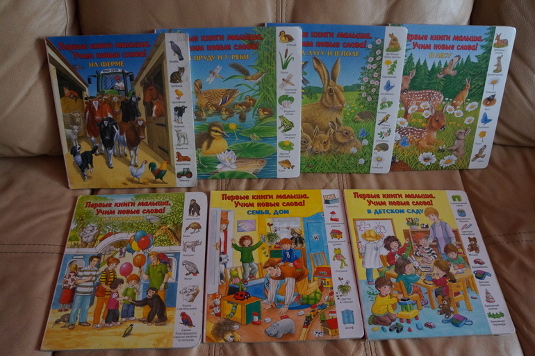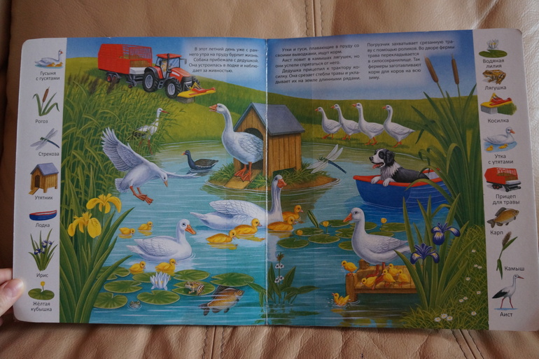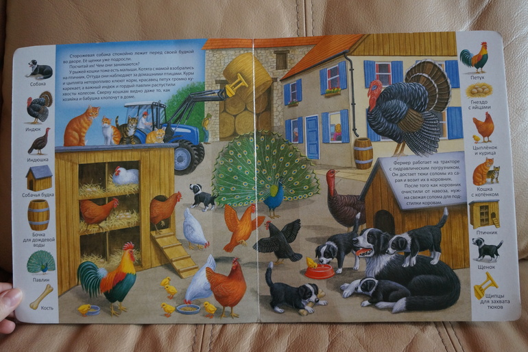 Это, наверное, самое лучшее наше приобретение, советую всем, кто еще о них не слышал. Правда огорчает только одно: год назад, когда я из покупала цена каждой книги была в районе 100 р., сейчас она выросла в 2,5 раза. Но эти книги все равно того стоят! Самая первая "На ферме" начала пользоваться популярностью еще до года, с помощью нее очень хорошо изучать домашних животных. Вот несколько иллюстраций: