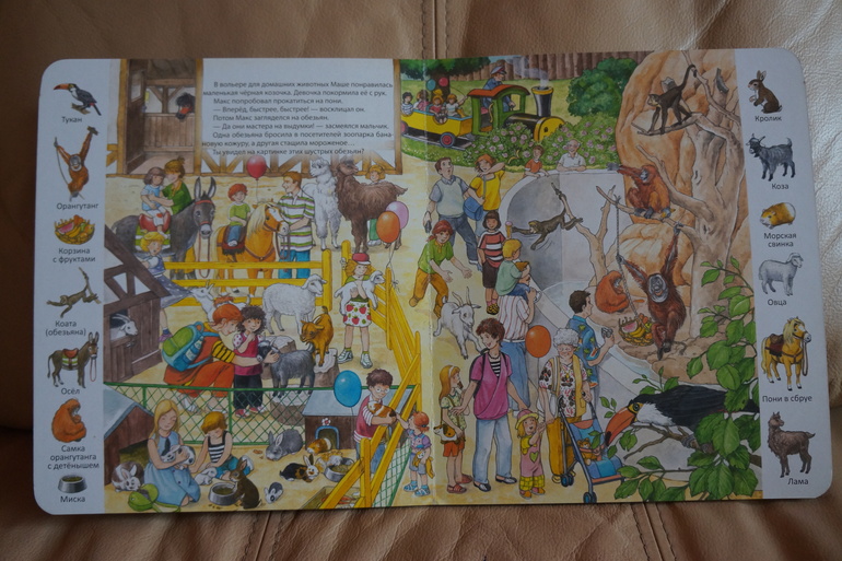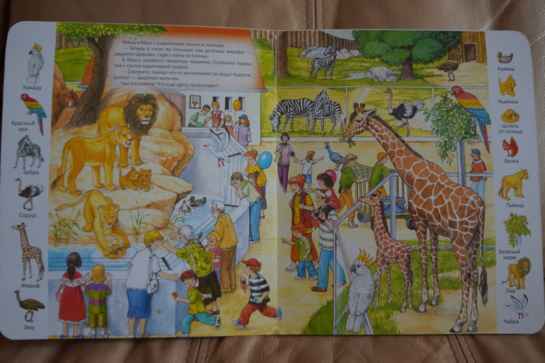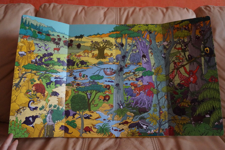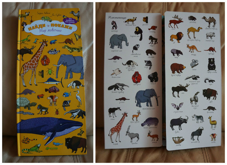 Книга огромная, с пятью разворотами: животные, рыбы, птицы, рептилии и насекомые. Вообще заявленный возраст 5-9 лет, но мы любим гляделки, поэтому заказала не раздумывая. Доча может часами сидеть и разглядывать ее.