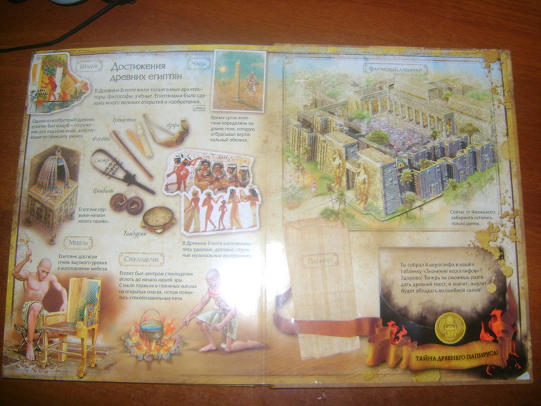 Еще в книге можно найти вот такое зеркало при помощи которого нужно прочитать текст,который написан наоборот (а именно узнать о том,почему косметикой в Египте пользовались не только женщины но еще и мужчины с детьми