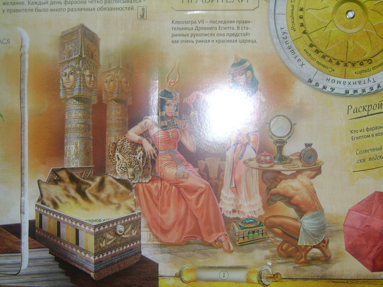 А вот и сами цари Египта-красивейшая Клеопатра,вверху есть маленькие открытки с правителями Египта(забыла сфотографировать)а внизу выдвигается часть про рассказ о любви Цезаря и Клеопатры)И задание при помощи солнечного диска и данных иероглифов узнать кто из фараонов взошел на трон в возрасте 9 лет