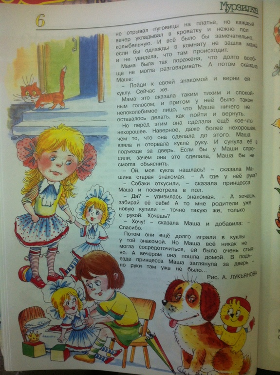 Мама это сказала таким тихим и спокойным голосом, и притом у неё было такое непоколебимое лицо, что Маше ничего не оставалось делать, как пойти и вернуть. Но перед этим она сделала ещё кое-что нехорошее. Наверное, даже более нехорошее, чем то, что она сделала до этого. Маша взяла и оторвала кукле руку. И сунула её в подъезде за дверь".