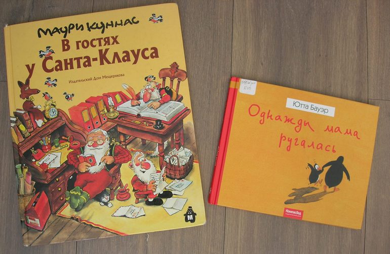 Пара библиотечных книг. "В гостях у Санта-Клауса" читал детям папа, так что ничего не могу сказать. А вот "Однажды мама ругалась" Ютты Бауэр.. была наслышана об этой книге, было интересно посмотреть реакцию детей. Первой реакцией было недоумение. Но! Теперь, если мама ругается, Вовка демонстративно восклицает: "Ооооо! Живот мой бросило в море!!". Вот такой эффект.