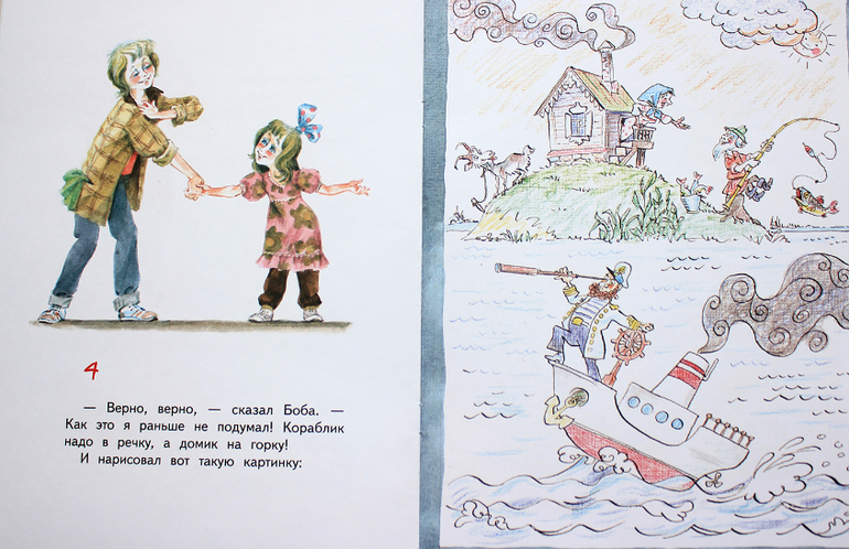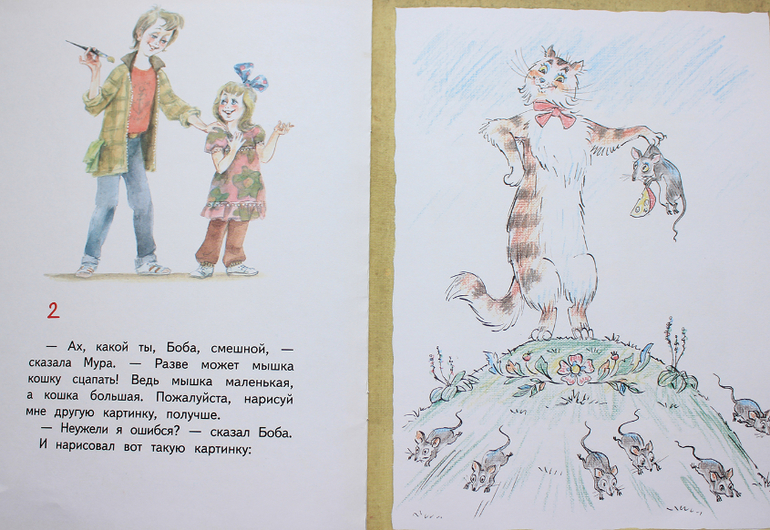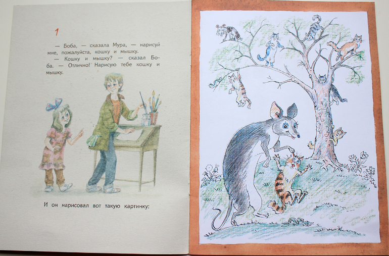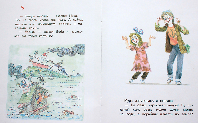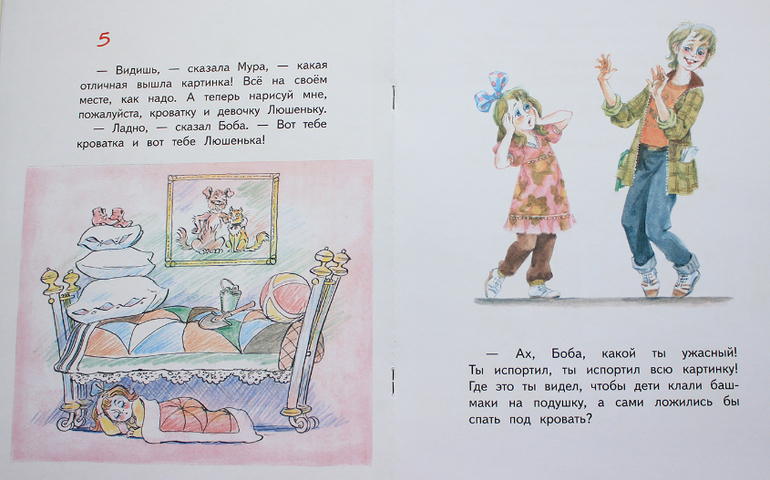 Идея книжки проста - Мурочка просит нарисовать Боба картинку, а он все время что-нибудь да путает. То мышку нарисует больше кошки, то девочку под кровать положит спать. А Мурочке все время приходится поправлять этого невыносимого Боба. А уж как нам полюбилось слово "чепуха" из этой книжки, дочка потом еще недели две пыталась все время его применять в своей речи и очень радовалась когда ей это удавалось.