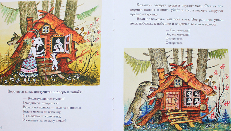 Это одна из первых наших сказок, которая, помимо основной морали учит ребенка сопереживать. Поначалу дочка сказке сопротивлялась, отворачивалась когда страсти накалялись, но потом когда поняла что с козлятами все будет хорошо сказку полюбила.