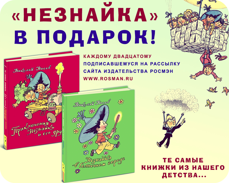 Друзья, мы решили порадовать подписчиков рассылки сайта издательства "Росмэн" (и будущих, и настоящих) подарочками! Каждому двадцатому подписавшемуся на нашу рассылку мы подарим "Незнайку"! Того самого, с иллюстрациями Г. Валька!