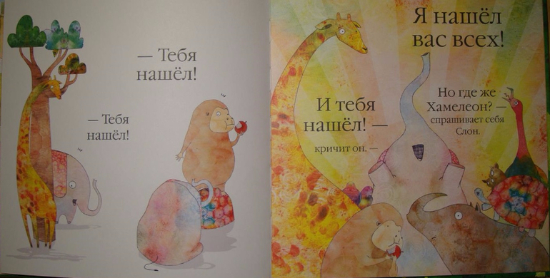 И вот игра на внимательность замечательна! На каждом развороте прячется маленький хамелеончик, найти которого не так уж просто.