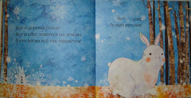 А вот с кроликом какая-то странность приключилась: согласитесь, что белый кролик зимой не меняется? Т.е. меняется сам кролик: он как раз становится белым и таким всю зиму и остается. Возможно, этот нюанс затерялся где-то при переводе.