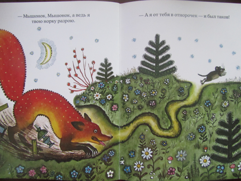 "Лис и Мышонок" покупала ещё дочке, когда ей было 2-2,5 года, но книга её не заинтересовала (( Очень я тогда расстроилась,а тут на днях вспомнила о ней и решила малышу показать..и произошёл просто фурор.. Сынок готов читать эту книжку хоть целый день - просыпается , идёт к своему ящичку с книжками и несёт мне её )). Я не знаю, что конкретно ему нравится, но на каждой странице он безумно радуется и что-то лепечит )). Хочется сказать слова благодарности В.Бианки за гениальный текст и Ю.Васнецову за не менее гениальные рисунки к нему!!!