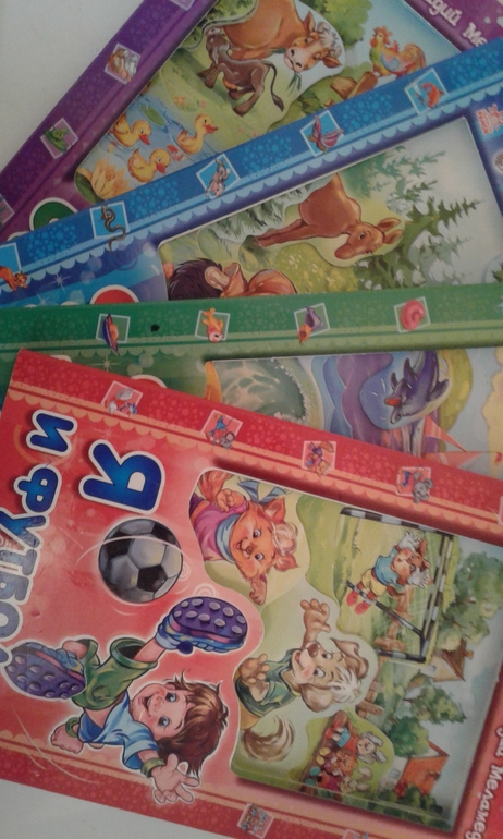 четыре книги, плотный картон, при этом лёгкая и удобная, сначала рассматривали и я читала, постепенно ребенок стал более заинтересован, стал показывать пальчиком по картинкам. Милые иллюстрации, и понятные четверостишия. Хотя по началу ребенок все равно мало что поймет. Книги эти у нас уже 1,5 года, а ещё ни порваны и не помяты особо)))