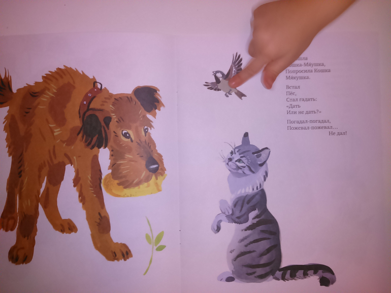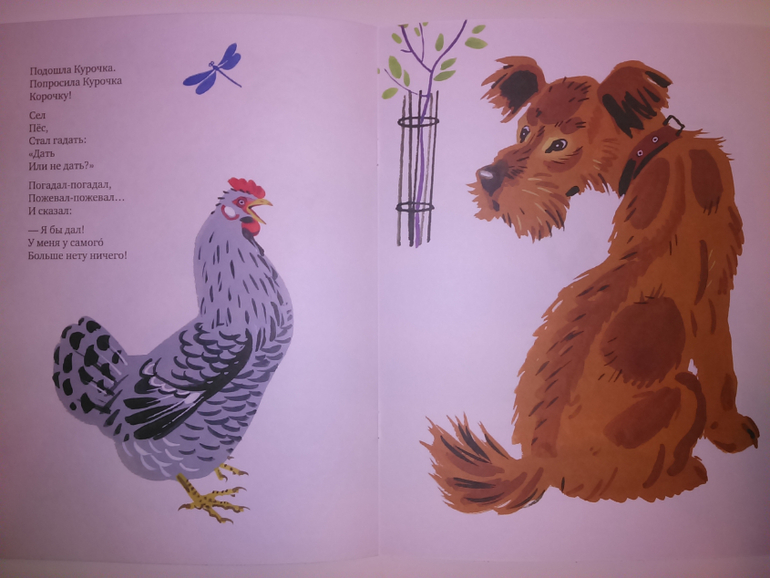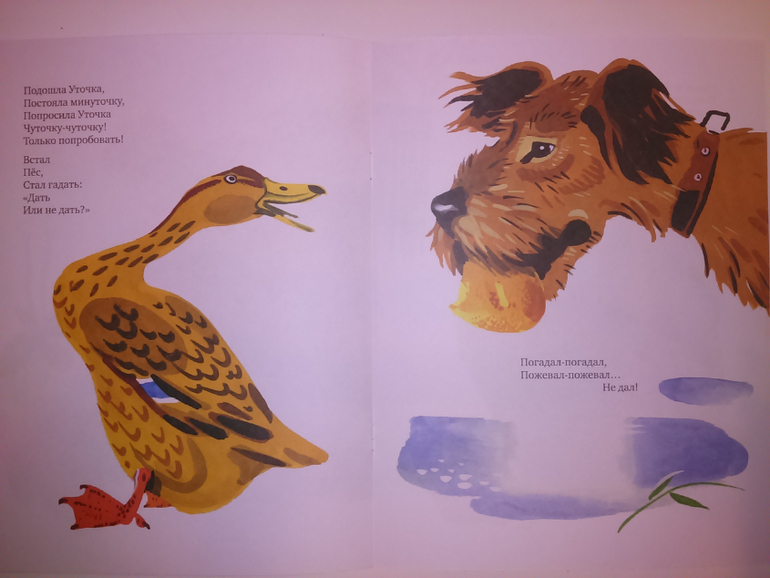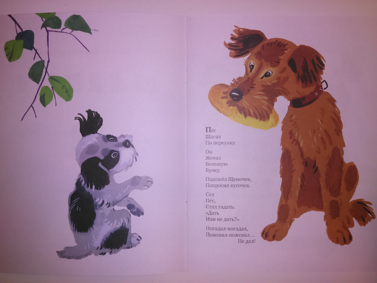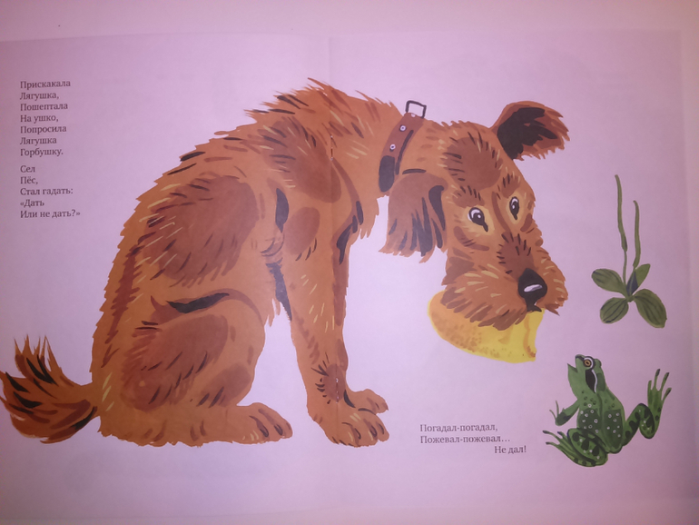 "И Щеночек, и Кошка, и Лягушка, и Уточка, и Курочка просят у Пса кусочек вкусной булки. А пока Пёс сомневается, угостить ли друзей, булка заканчивается! Стихотворение Эммы Мошковской полно мягкого юмора и заставляет улыбнуться над незадачливым Жадиной."