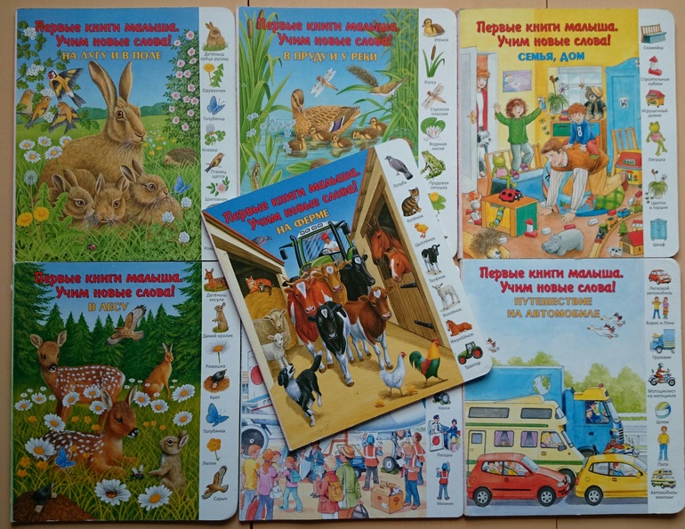 Первыми детскими книжками могут быть сборники, энциклопедии (даже плакаты) сгруппированные по темам (домашние животные, лесные животные, фрукты, транспорт и тд), где минимум текста.