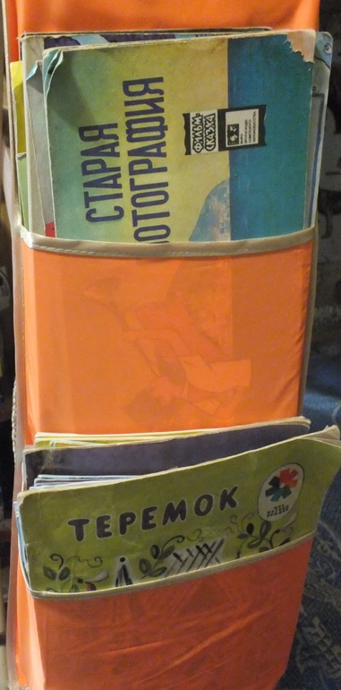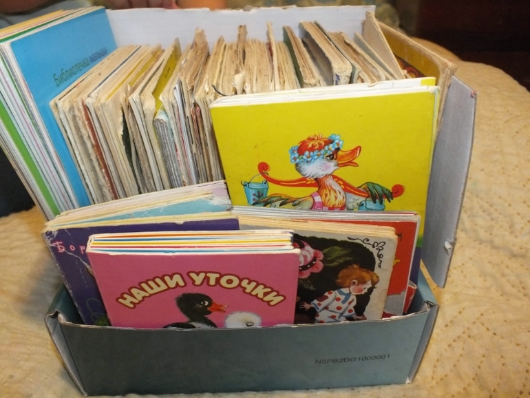 И еще одна находка-ящичек для книжек-малышек,который поселился на столе.Здесь нашли приют и букинстика и новые.Дочка сначала доставала только новые-они ярче,наряднее,а теперь и остальные рассматривает.Там конечно,не все по возрасту,но она их для чтения и не предлагает.