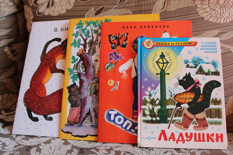 3. Топ-топ-топ. И.Демьянов из серии "Любимая мамина книжка". Дима очень любит эту книжку - и про козу, и про оладушки, и про ручки-ножки. Только мне почему-то не нравятся эти акварельные иллюстрации...