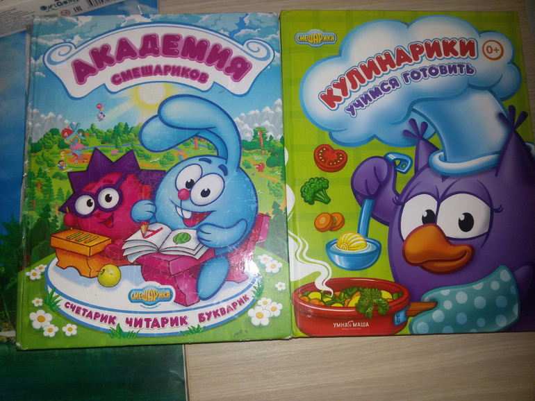"Академия смешариков : счетарик, читарик, букварик" и "Кулинарики. Учимся готовить."