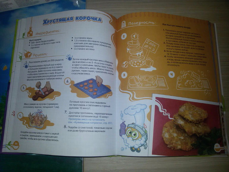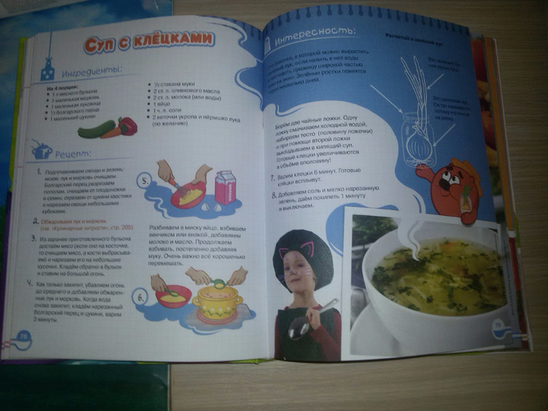 вторя книга тоже такого качества. на каждом развороте вы найдете рецепт и какое то развлечение или информацию. Рецепты по пошагово, список ингредиентов. все рецепты легкие, доступно объяснено, продукты обычные. Вот о такой покупке я не пожалела, а даже чему то научилась. Самая толковая книга рецептов для детей.