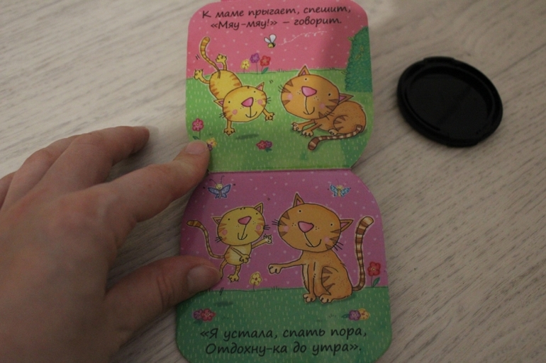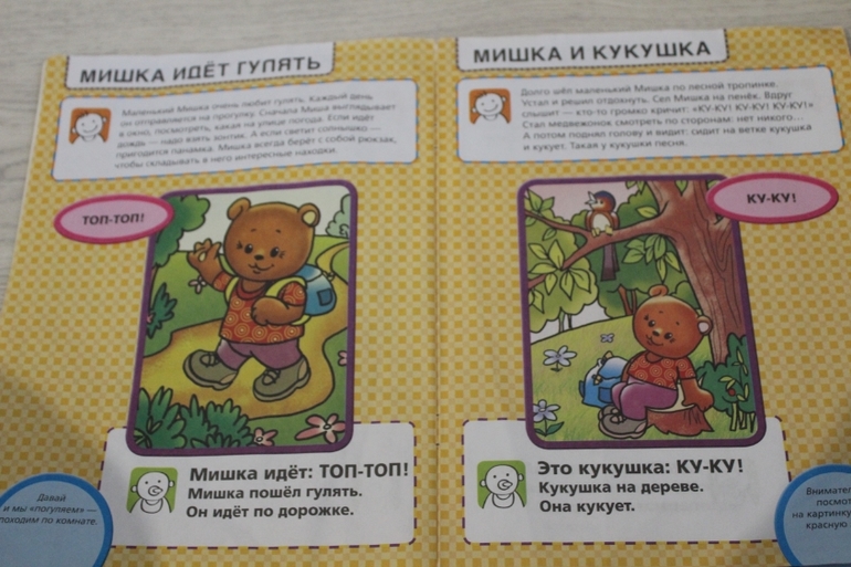 Моя дочь вообще очень любит медвежат. Да и истории простые и понятные. Здесь есть три варианта, как можно рассказывать книжку: от самого простого до более усложненного. В зависимости от возраста малыша и его словарного запаса вы выбираете сами как рассказывать эти истории. Можно конечно, и от себя чего-нибудь добавить. Эта книга помогла нам расширить словарный запас некоторыми словами, некоторые из них перекочевали в жизнь.