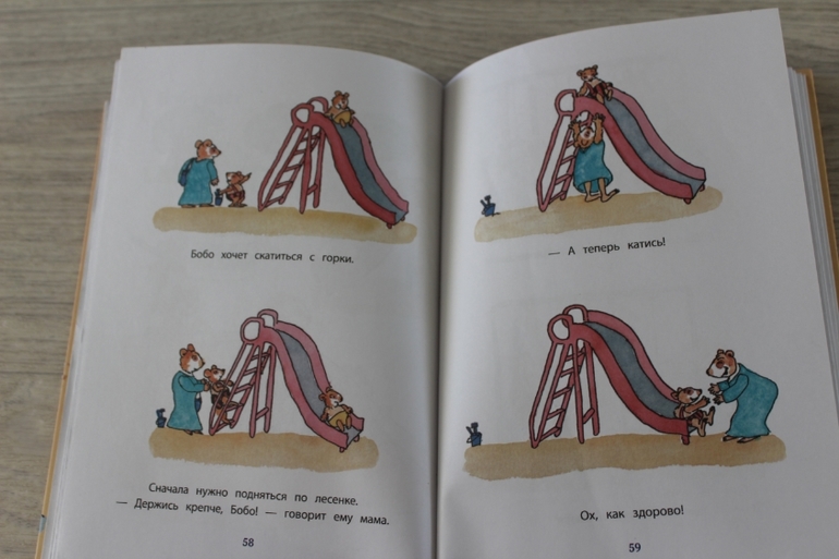 И ни разу не пожалела, что купила. Истории о Бобо очень близки малышам и понятны. Моя дочка постоянно, читая книгу, узнает в ней в себя. Ее самые любимые сюжеты, это которые очень хорошо ей знакомы в жизни. Приведу фото нескольких из них.