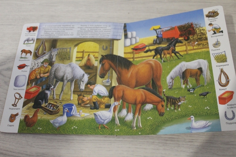 Вообще мы по ней глядим-то в принципе как и по всем другим книгам. Мама рассказывает кто-что делает, задаю вопросы дочери, она отвечает (в основном кто как говорит, что делает), иногда прошу что-нибудь найти, показывая на картинку на полях. НО пока нас это особо не увлекает, а я не настаиваю. Нам больше здесь интересны животные, особенно лошади! Это одна из наших "любовей")))