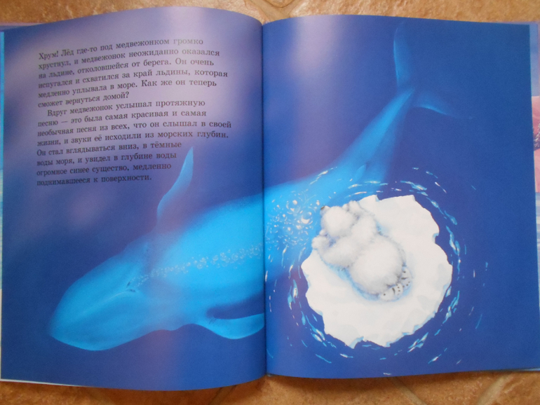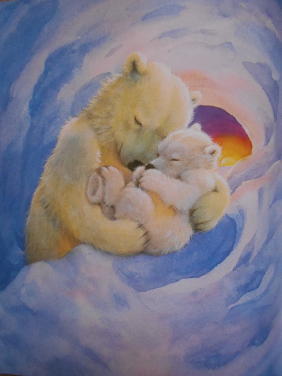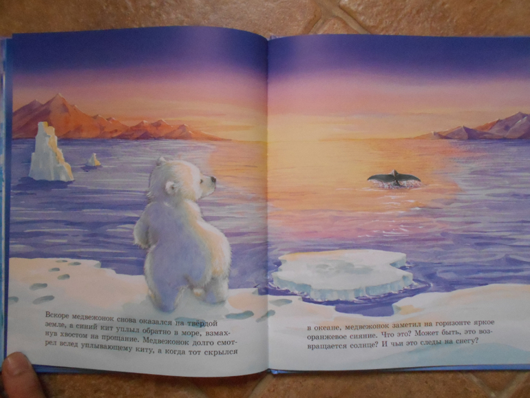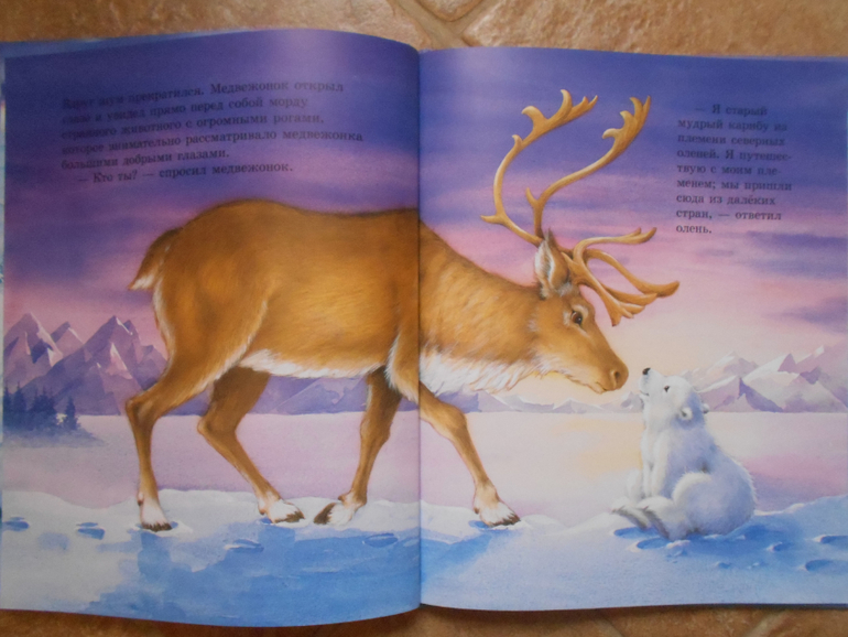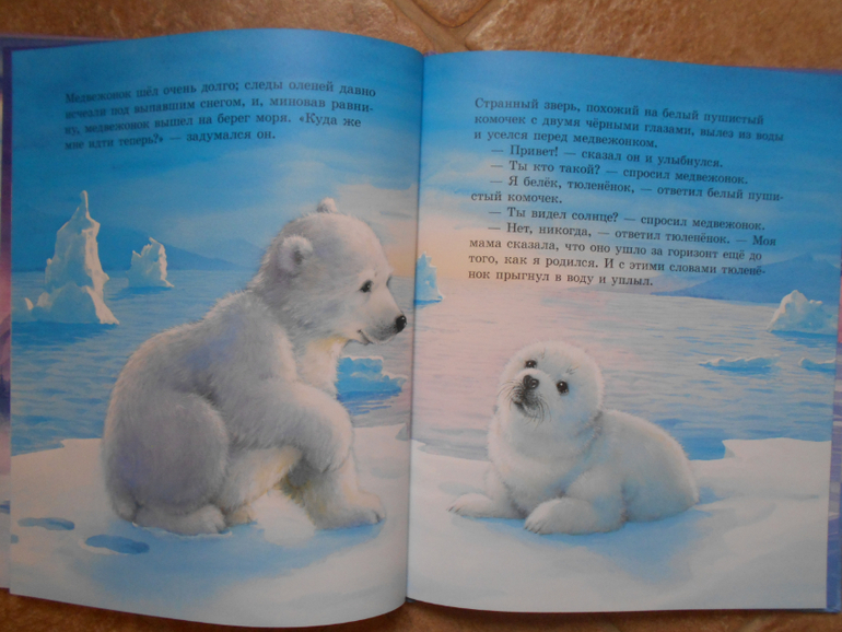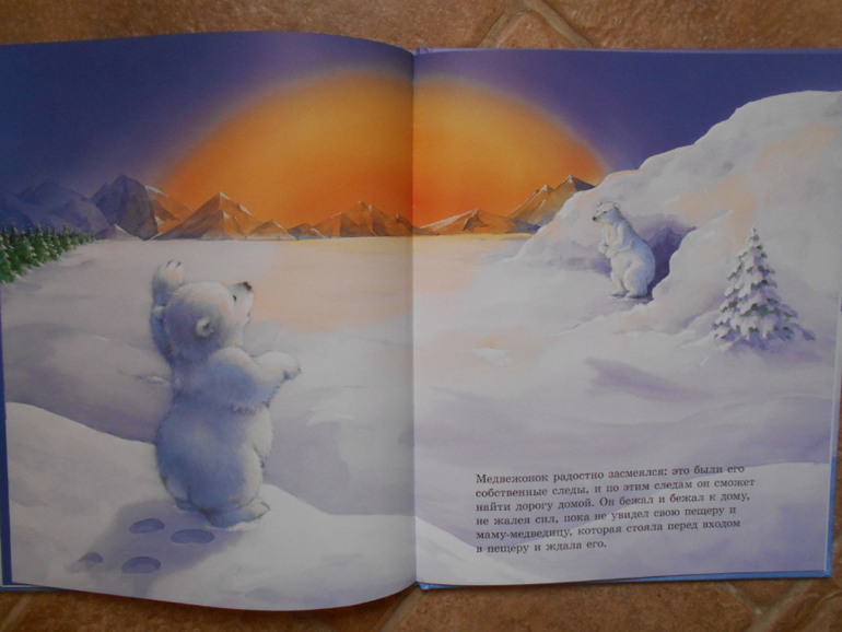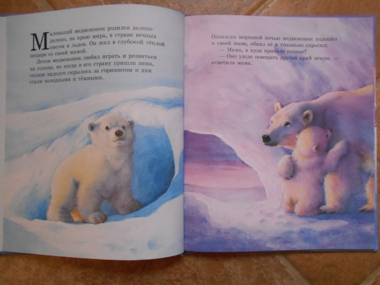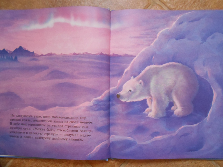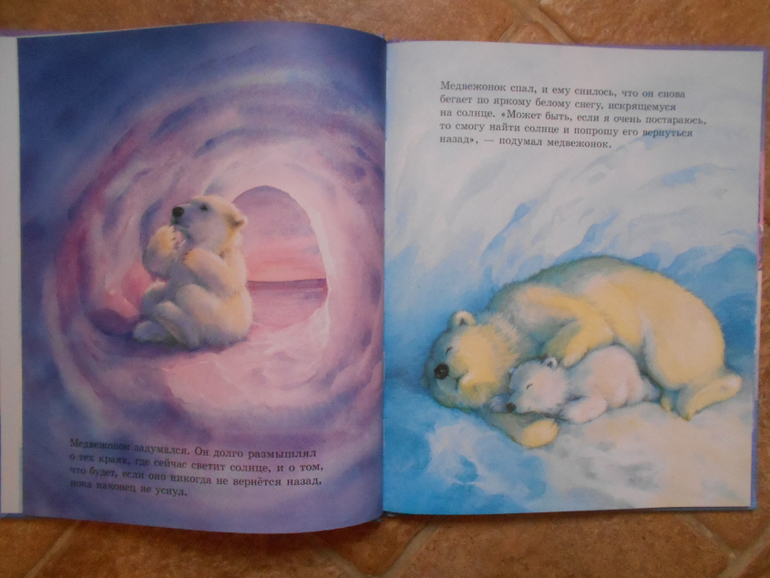 История весьма проста: медвежонок на севере отправляется искать солнце. Знакомая история, не правда ли?! Только в нашем случае это был мамонтенок и помнится, он искал маму) Этот медвежонок такой вот родной, ну просто свой в доску:) Девчонки единодушно решили, что это Умка из мультика. И правда определенная "перекличка" здесь присутствует! Мне эта книга всегда напоминает детство, то ощущение СЧАСТЬЯ которое тогда было повсюду. Уж не знаю, то ли благодаря великолепным иллюстрациям, то ли доброй истории. Восхитительная книжка!!![]()