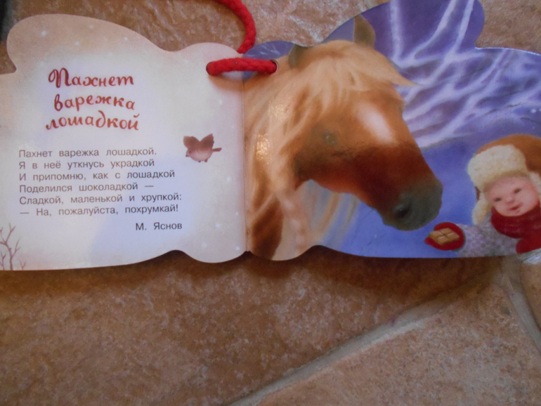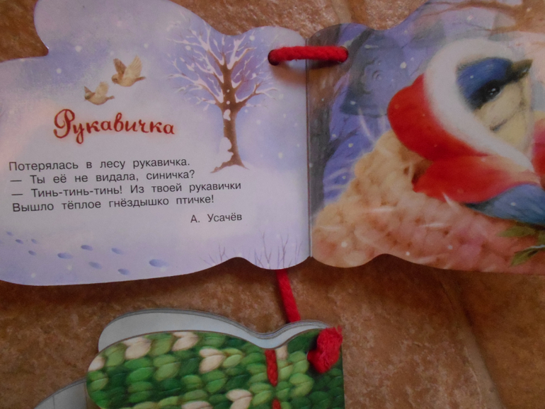 Вот такие вот миленькие зеленые рукавички, которые содержат в себе несколько зимних стихов. Как они нам нравятся! Мы их периодически грызем, читаем стихи, снова грызем:) А этот красненький шнурочек так удобно мусолить:)![]()