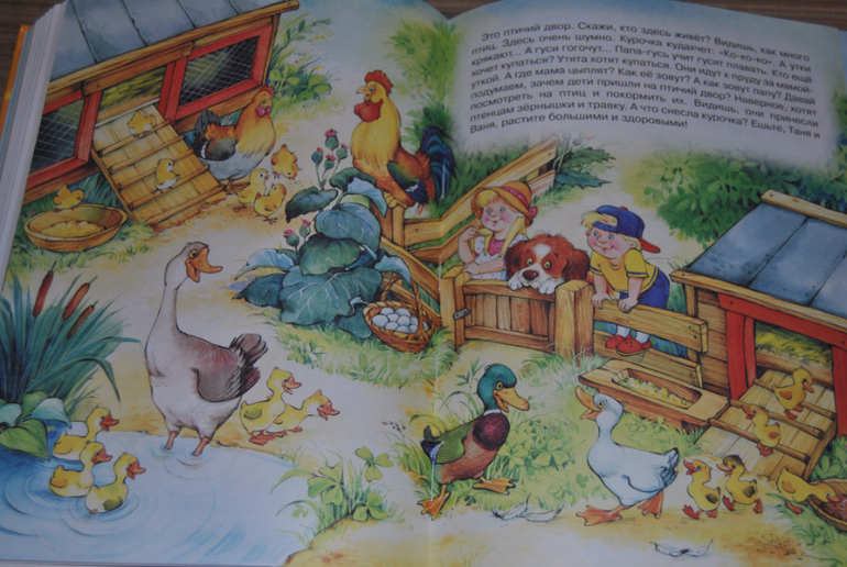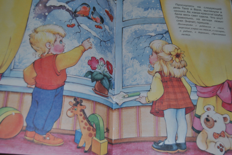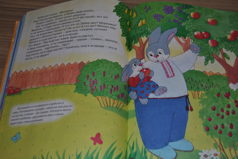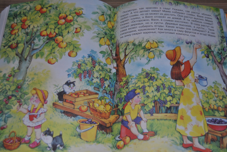 Здесь можно узнать что растет в саду, а что в огороде, описываются фрукты и овощи, луговые растения. Дети знакомятся с разными временами года, осенью собирают листья, зимой катаются с горки, лепят снеговика и отмечают Новый год, весной наблюдают как меняется природа.