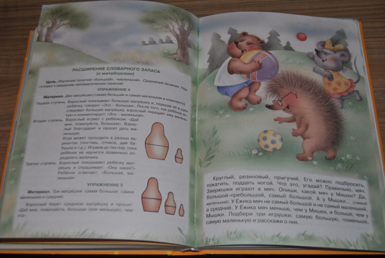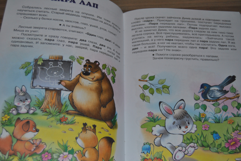Задания даны на разворот одно задание, написано чему учит задание, что приготовить нужно, описывает само задание и история с животными