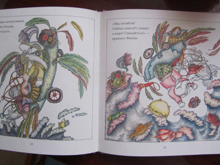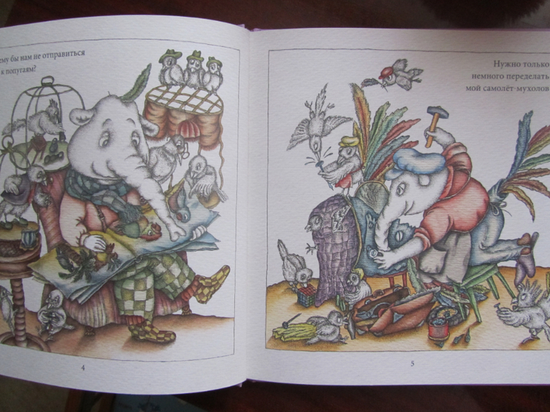 Здесь история пр слонёнка, который вместе со своими питомцами-птичками решил полететь в гости к попугаям в жаркие страны. Но по дороге самолёт сломался и упал в воду, однако птички спасли слонёнка, и они благополучно добрались до попугаев ))