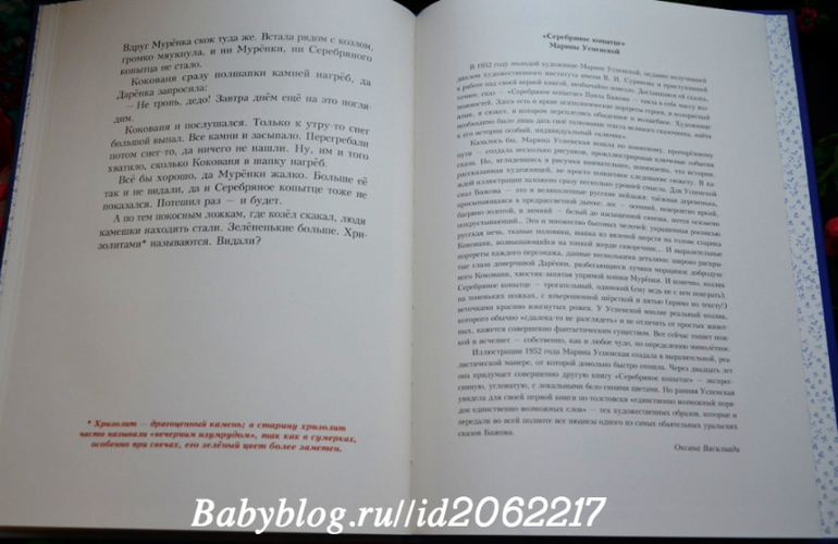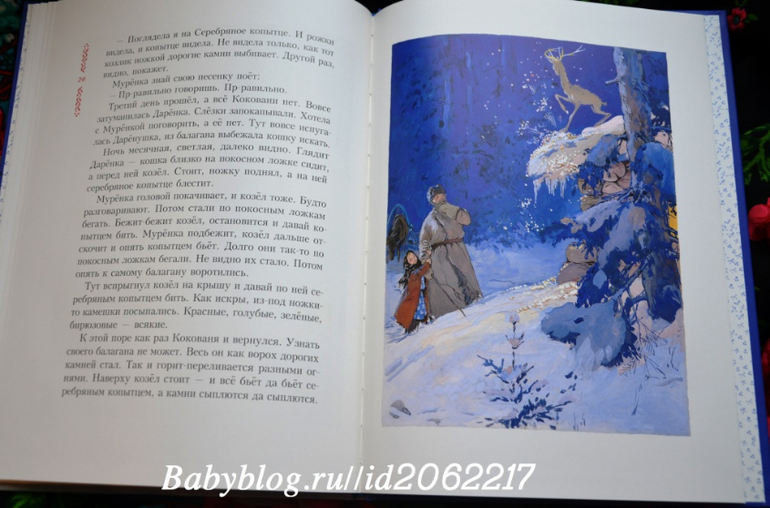 "Много чудес хранят Уральские горы: распускается здесь неувядаемый каменный цветок, выползает из земли сверкающий змей, пляшет в огне костров девчонка-огневушка… И живёт на Урале козлик Серебряное копытце - в иллюстрациях Марины Успенской робкое, ранимое, трогательное волшебное существо. Не каждому он показывается, но кто ему приглянётся, с тем он поиграет и камнями самоцветными одарит…"