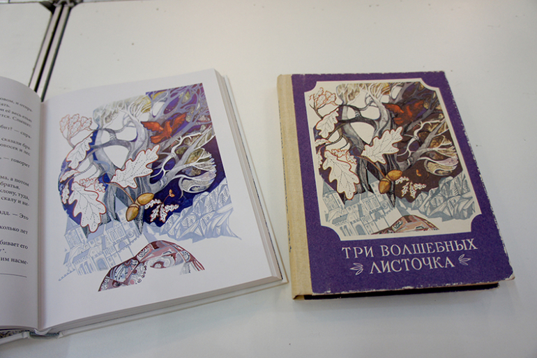 Иллюстрация, которая в старой книге на обложке, не из сказки "Три волшебных листочка", она из ДРУГОЙ сказки. Тогда просто не обратили внимание на это, ну листочки и листочки, подумаешь. Речь исправила эту ошибку.