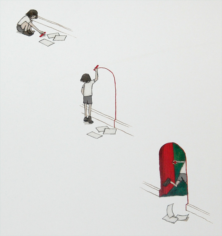 Девочка, не находящая отклика у занятых взрослых, скучает и создает свой мир, входя в него через нарисованную красным мелком дверь. Она не рисует весь мир, мелок нужен ей только в минуты опасности. Ее мир не похож на реальный, в нем плавают на лодке прямо по стенам замка, а в небе летают диковинные машины. А опасностей в ее приключении хватает. Но всё кончится хорошо.