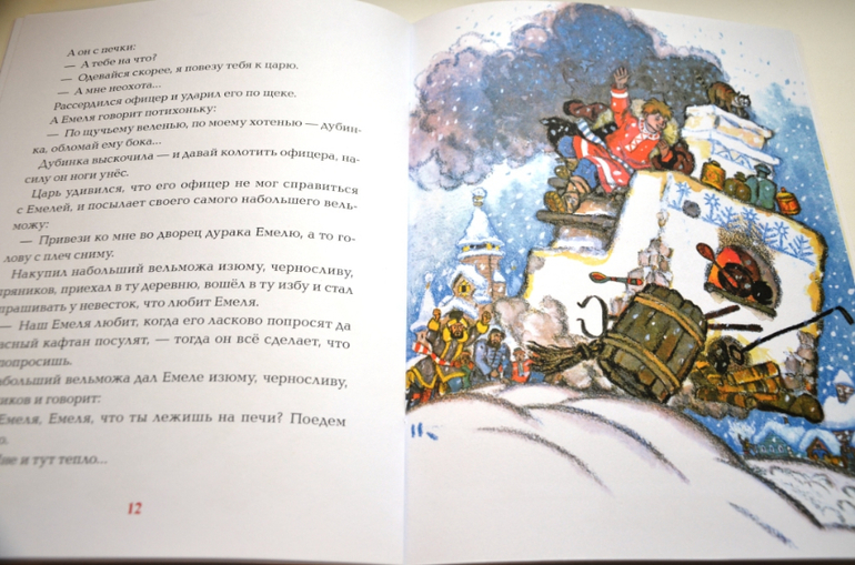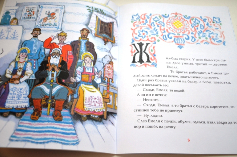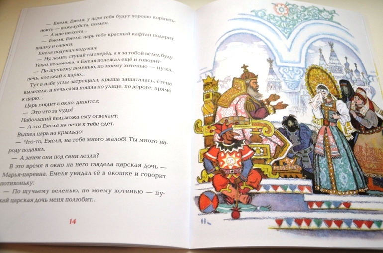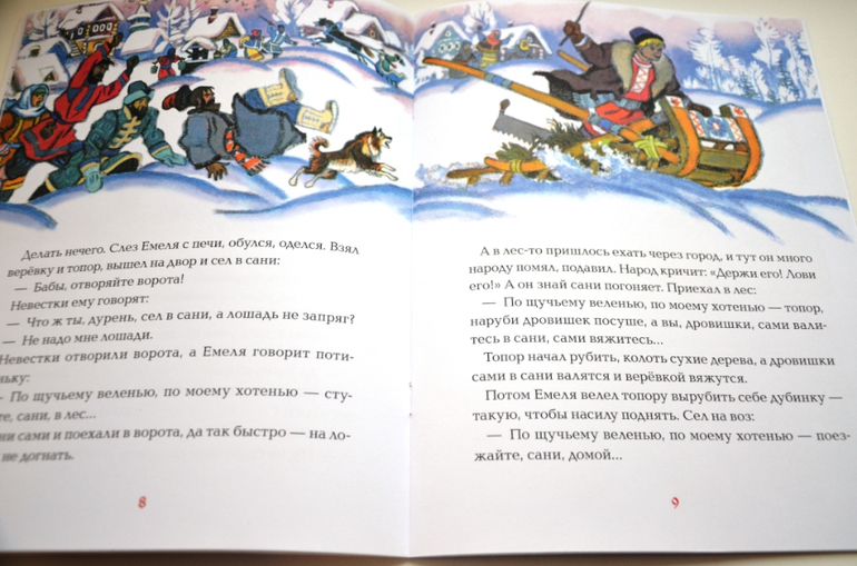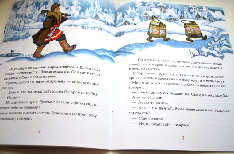 И напоследок оставили самую длинную "По щучьему велению" надеялась уболтается, уснёт, но не тут-то было, слушала с интересом - очень обеспокоилась судьбой пойманной щуки: "мама, куда рыба делась? где она?", осталась в недоумении от вёдер-самоходов и саней ("сами, как сами? ого, волшебные!"), не думаю, что поняла весь смысл сказки, но с сюжетом познакомилась. А в конце огорошила: "почему он дурак, Емеля?"