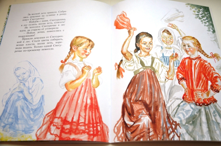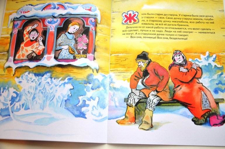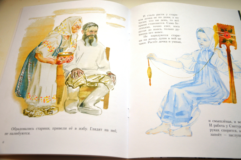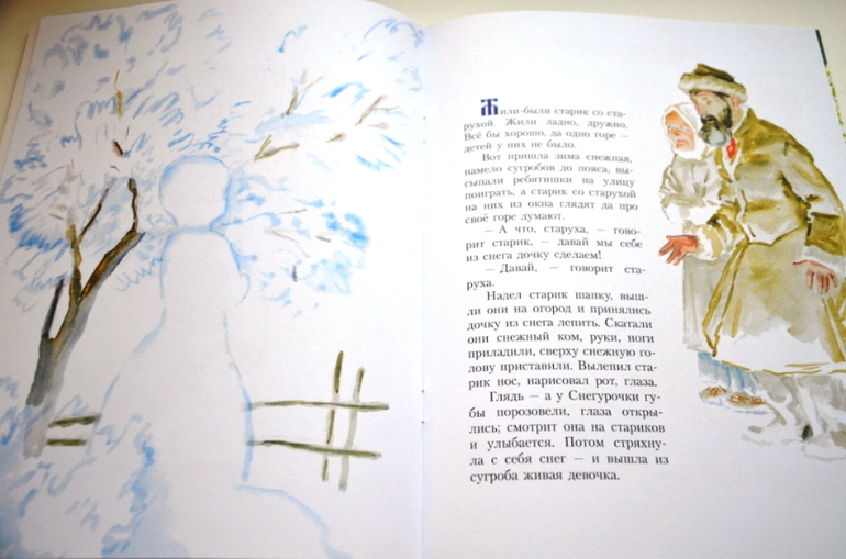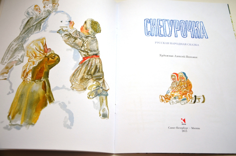 Далее "Снегурочка", здесь уже моя потеплела и стала активнее: "смотри какие дедушка и бабушка; ого живая стала; растаяла! как!?" Иллюстрации Алексея Пахомова прекрасны, умеет он так чутко изображать лица людей, особенно старшего поколения (очень люблю его "Бабушку, внучку и курочку"), сюжет ребёнка явно заинтересовал, включим в наш книжный рацион обязательно.