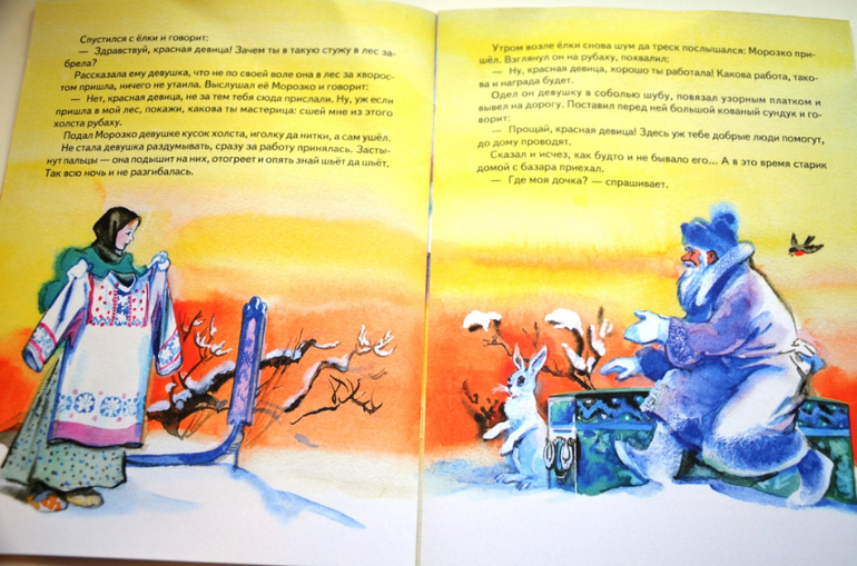 Первую начали читать книгу "Морозко", в иллюстрации Нины Носкович, которые дочкой воспринимаются очень хорошо (например, успех "Гусей-лебедей" был очевидным, после её иллюстраций стала пересказывать самостоятельно содержание и сюжетно играть). Слушала внимательно, морозного Дедушку узнала, однако сложилось впечатление, что в общем текст остался непонятным, улыбалась лишь при высказываниях собачки.