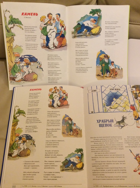 Наверное, если уж совсем в общих чертах, мне показался самым детским выпуск с рисунками Митурича (но там практически всё про природу/животных). И с Токмаковым, но там последний рассказ как дети в пылу игры убили котёнка.