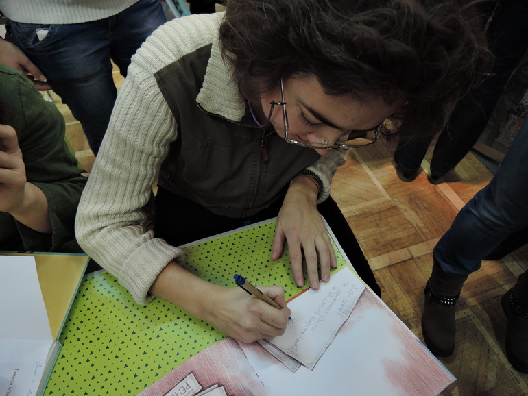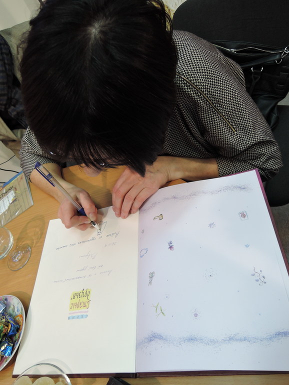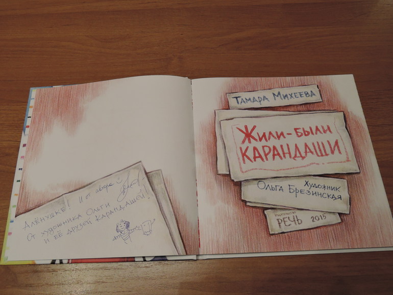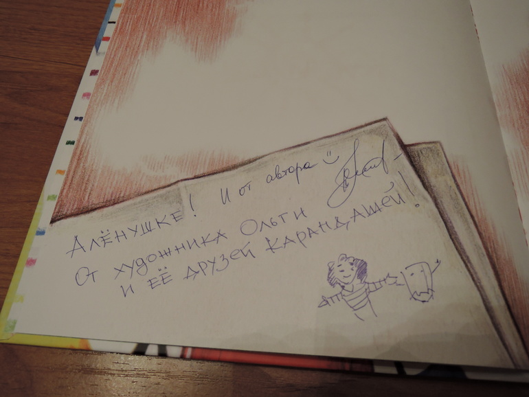 Положительные эмоции оставила встреча с Тамарой Михеевой. Присутствовала на ней и художник любимой книжки младшей доченьки - Ольга Брезинская "Жили-были карандаши". Пришлось к автограф-сессии приобрести дубль книжки, но Алёна была очень рада, особенно рисунку)
