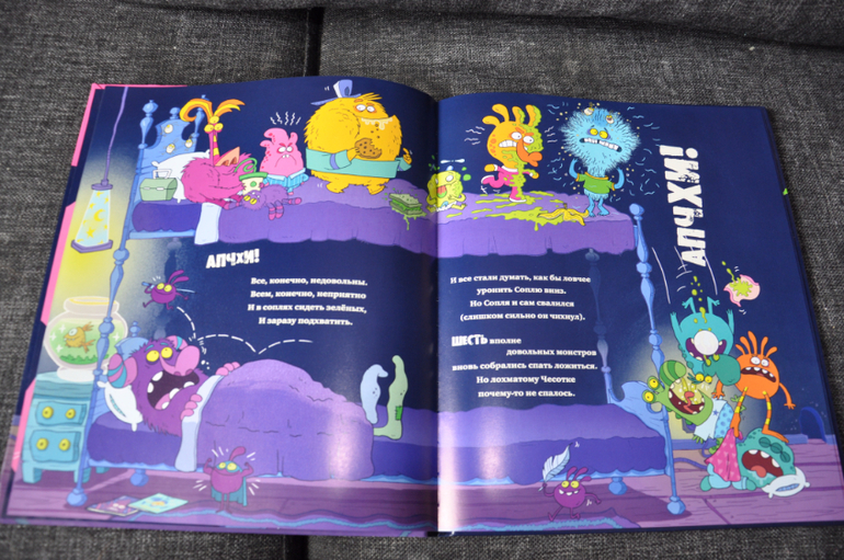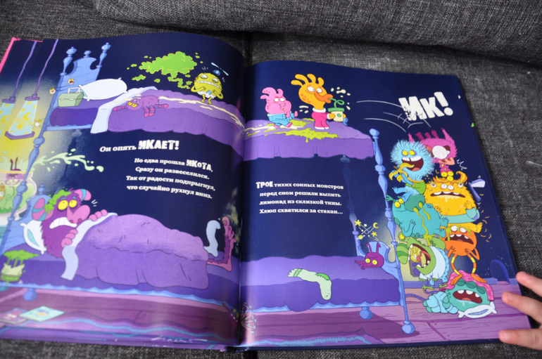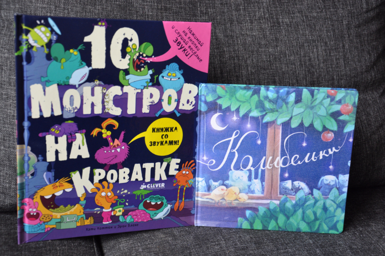 для самых маленькихПродолжу тему книг перед сном. Одними колыбельными сыт не будешь. Купила "10 монстров на кроватке" со звуками. Вариация на тему английской считалки, когда кто-то по очереди выпадает из кроватки или выпихивают.По иллюстрациям и по тексту можно сказать, что на наши 2.5 года книга рановата, потому что от страницы к странице меняются местами монстрики, но ничего прям глобального не происходит, поэтому рекомендуется детям, которые уже научились выцеплять детали из а первый взгляд похожих картинок. Текст прикольный, много слов, которые нам неизвестно видимо " чавкать, хрумкать", имена монстров типа "Икоша", в общем в духе Остера и вредных советов))