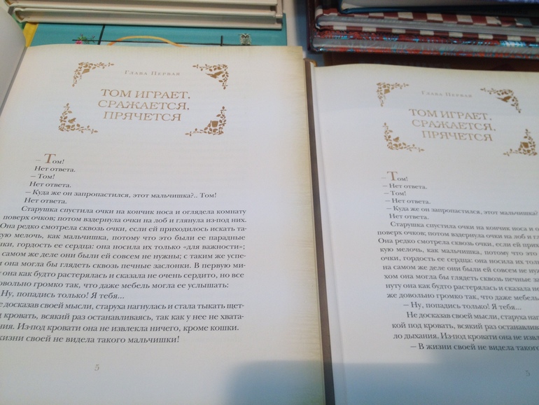 Кстати, пользуюсь случаем, чтобы сравнить своего "Тома Сойера" из первого тиража "Нигмы" с вновь переизданным - разница есть! Помимо исправленных опечаток, по словам представителя издательства, произведена цветокоррекция. Однако я лично заметила разницу в цвете только на обложке, внутри мне книги показались одинаковыми, только в новой немного другая бумага - чуть тоньше, но не критично. Новое издание замечательное! На фото оно слева.![]()