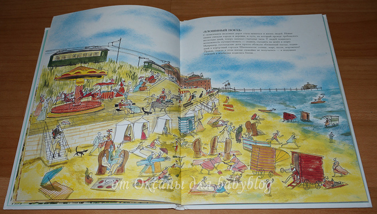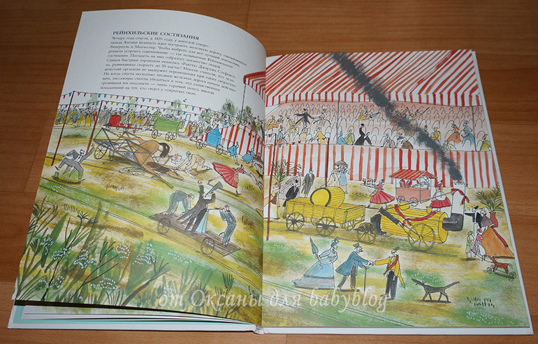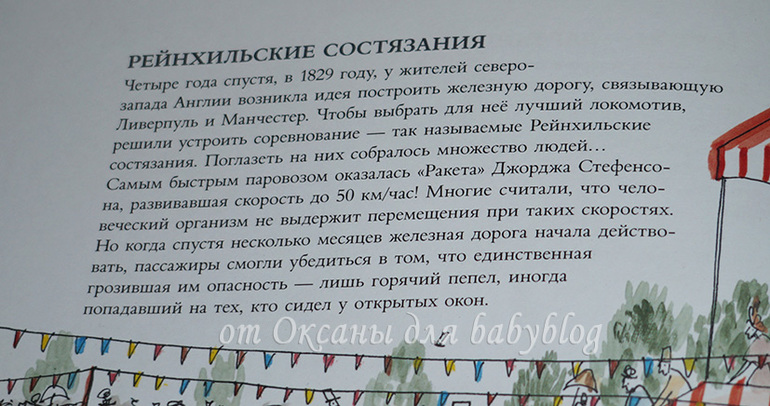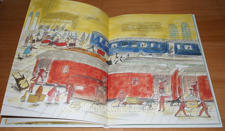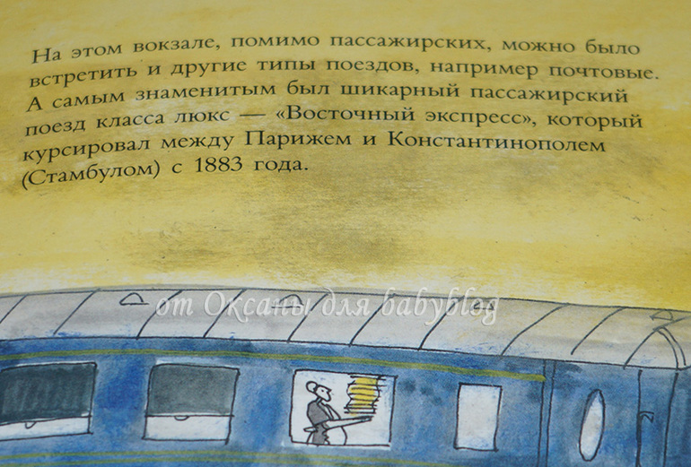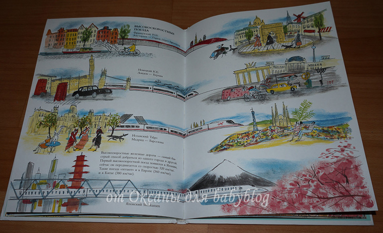 Повторюсь, текста в книге мало (поэтому если только читать книгу, то закончится она очень быстро). Зато картинки можно рассматривать очень долго. Это, на мой взгляд, не энциклопедия, а скорее виммельбух (wimmelbuch, то есть книга для рассматривания со множеством мелких сюжетных картинок) на тему поездов. И некоторые энциклопедические сведения в придачу (при этом текст является скорее ознакомительно-увлекательным).