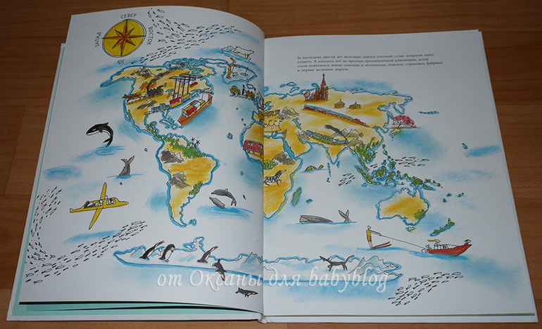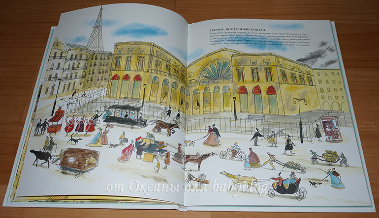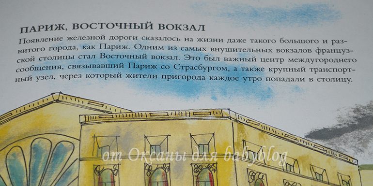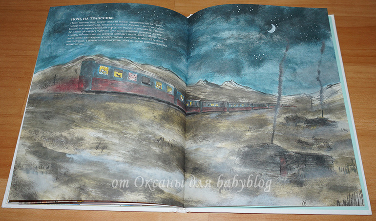 Есть в книге и разворот о России. Упомянута наша Транссибирская магистраль. Вполне атмосферная иллюстрация - бескрайняя степь, лунная ночь, струящийся из юрт дымок.