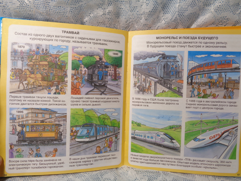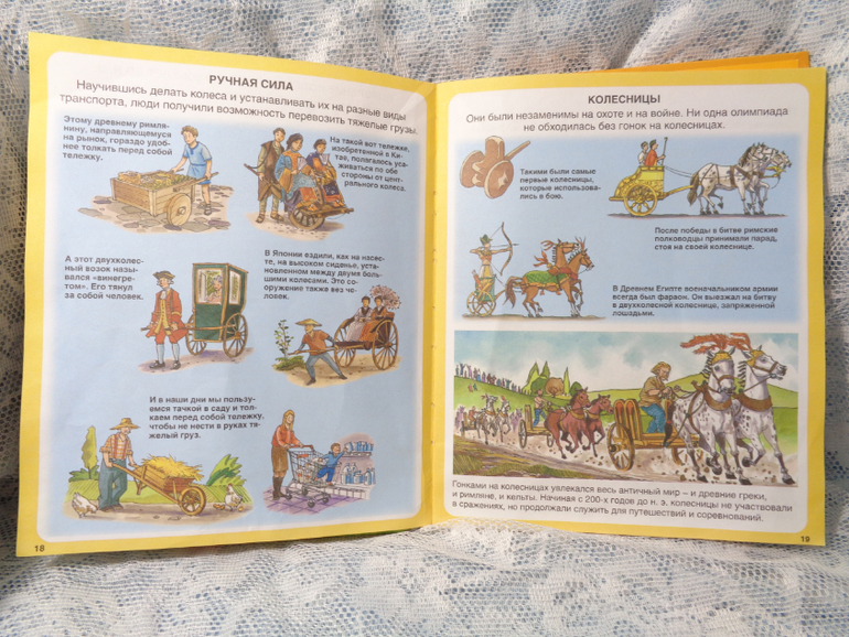 Супер хит. Вообще-то она была куплена навырост и ждала бы своего часа, если б не пошли мы на массаж. Взяла я ее с собой, чтоб Серегу развлечь чем-то новым, а она ему так понравилась, что месяц уже с ней не расстается. Сам смотрит раз 20 в день, наверное, и приносит читать несколько раз в день. Ну а как - тут есть все, что нам нужно: всевозможные машины, собаки ("аф") и лошади ("игоо"). Мне нравятся и иллюстрации, и содержание - краткая информация об изобретении и назначении разных видов транспорта (от машин, самолетов и кораблей до велосипедов, мотоциклов и детских колясок).
