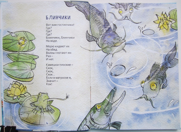 Вместе с поэтом Олегом Сердобольским в игру включается и художница Анна Кожевникова. Точнее - пробует включится. На мой взгляд, не всегда получается. И там, где в стихотворении полёт, лёгкость, свежий бриз и солнечные блики, на иллюстрации всё как-то плоско и скучно. Например, вот этот разворот оставил меня в недоумении: