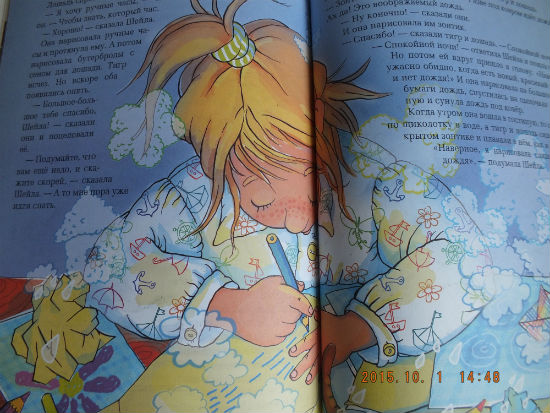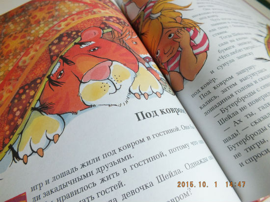 Сказка "Под ковром" необычная. У Биссета вообще все сказки необычные. Они без приключений. Только картинки и разговоры. Я же говорю, что очень английская книжка. Так вот, в сказке "Под ковром" идет речь про то, что в гостиной под ковром у девочки жили тигр и лошадь. Воображаемые, конечно. А то как бы они там поместились? И вот девочка рисовала им сахар (кормила лошадь) и другие нужные вещи. И зонтик рисовала, и дождь.. Ну вы понимаете: дети вечно воображают, что кто-то живет у них под кроватью или вот под ковром.