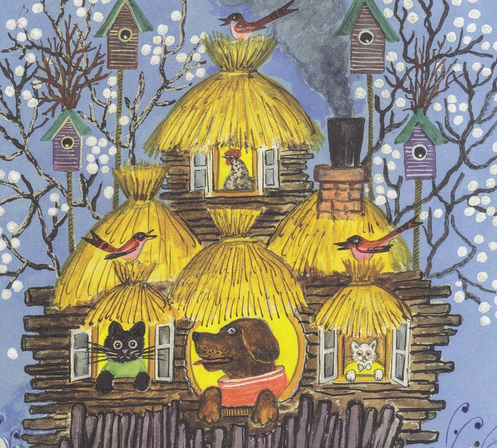 Собака, кот, коша и курочка. художник Юрий Васнецов