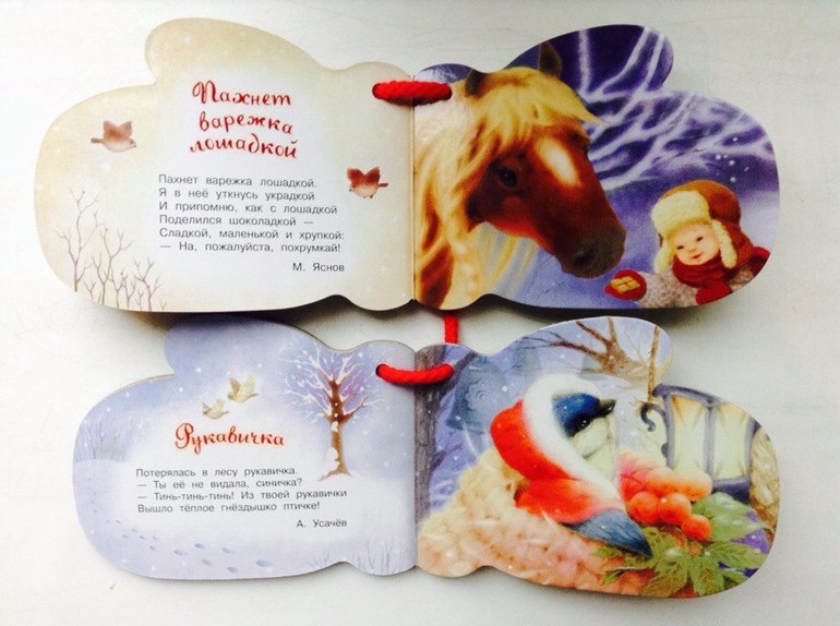 Маленькая, а точнее сказать, две маленьких книжечки в виде рукавичек. Соединены между собой прочной веревочкой. В каждой рукавичке по четыре разворота. Качество печати отличное, плотный глянцевый картон. Милые стихи и очаровательные иллюстрации к ним. Эта книжечка прекрасное дополнение к новогоднему подарку, для детишек 0-3года. Мы из нее выросли, но я не могла пройти мимо такой красоты. Почитали, посмотрели и отложили. Покупала ее для создания зимнего, предновогоднего настроения, с чем она справилась на отлично! Может быть выучим что-нибудь к Новому году))