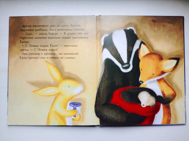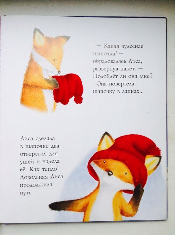 Мы читали ее в прошлый новый год, сейчас вспомнили и решили перечитать. Хорошая, добрая история о ежике, которому Дед Мороз прислал в подарок шапку.Он решил что она ему не подходит и подарил ее своему другу. И так эта шапка переходила от одного зверька к другому, пока не вернулась к ежику.Сюжет простой и понятный даже двухлетнему малышу. Интересна эта книжка еще и тем, что шапка на ощупь бархатная ( сделано напыление). И так на каждой страничке. Нежно любим и вам советуем)))