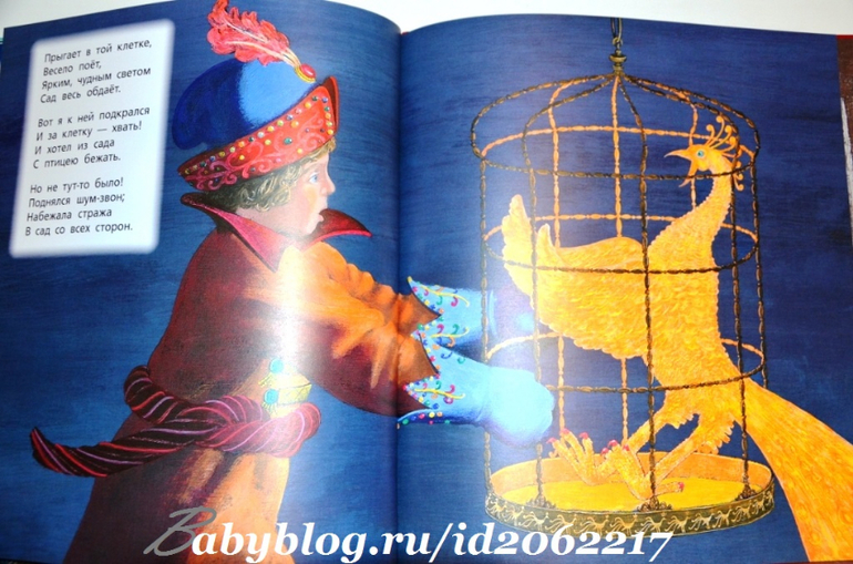 Целый разворот посвящён Жар-птице. На тёмном фоне, глубоко синем, она словно светится, горит, и лицо мальчонки освещается светом от ее пламени. Очень красивый разворот!